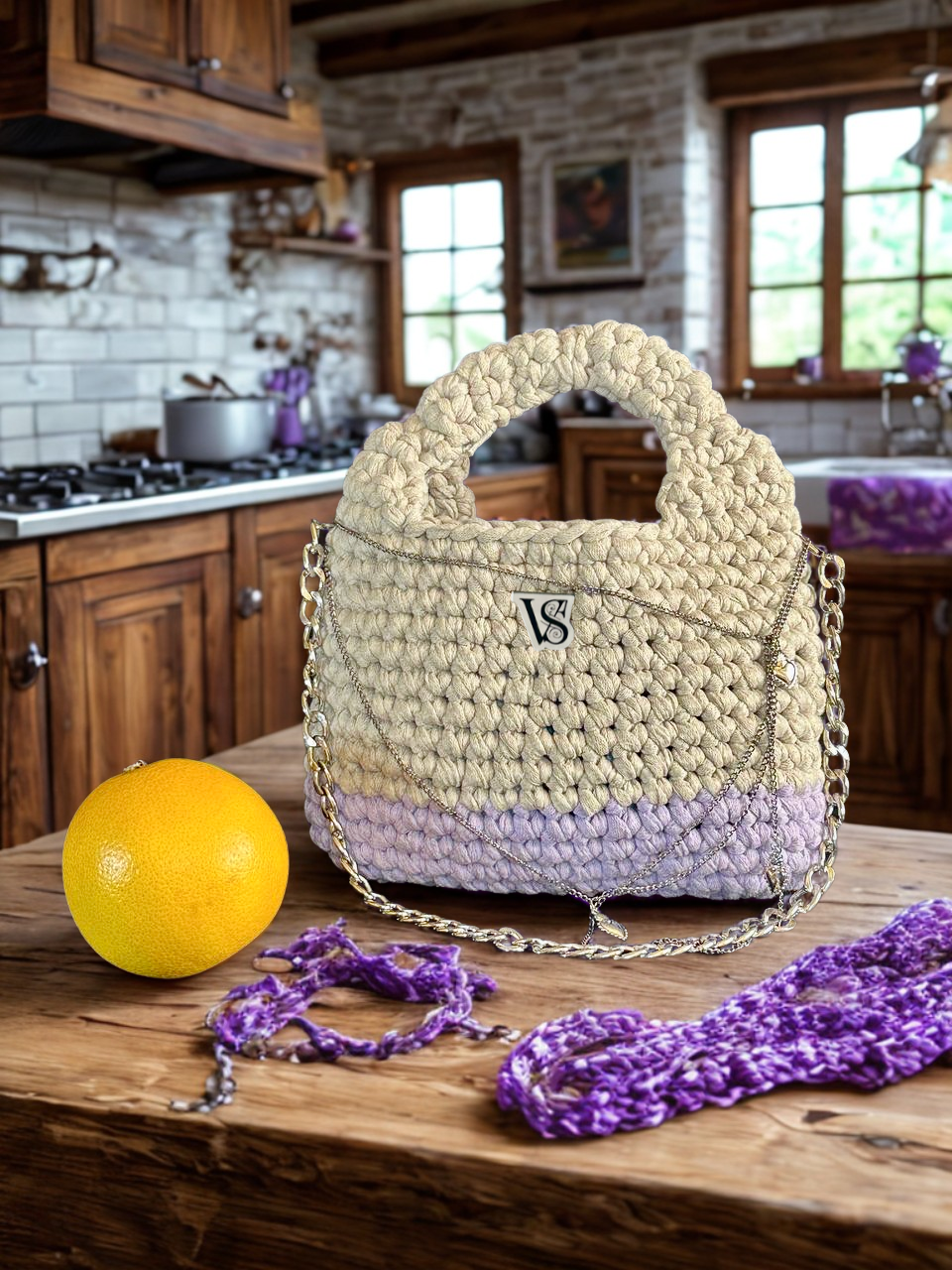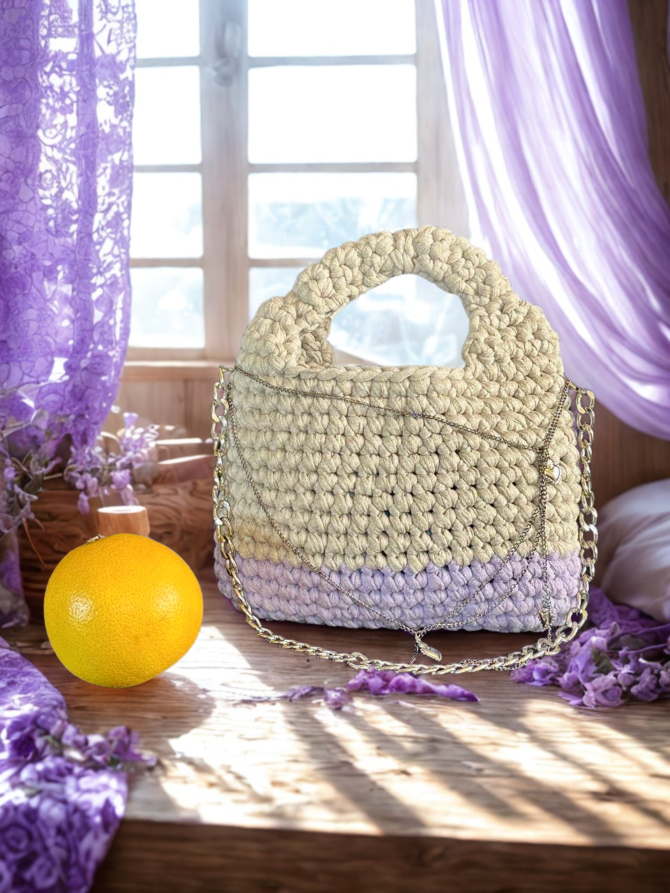 Lavorata interamente a maglia bassa, questa borsa presenta una texture morbida e compatta, ideale per l’uso quotidiano. Il manico integrato la rende comoda da portare a mano, mentre la tracolla removibile in catena da 1 metro offre un’alternativa pratica per chi desidera portarla a spalla o a tracolla.