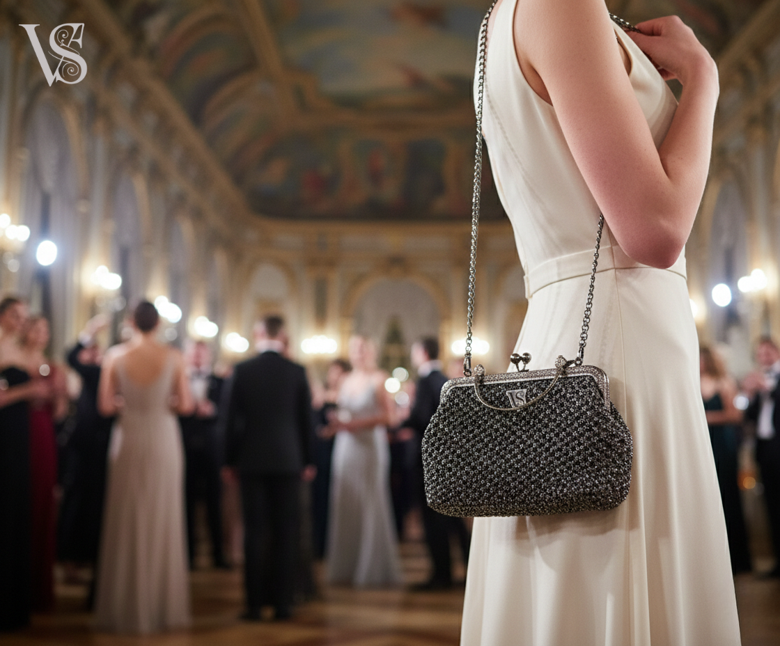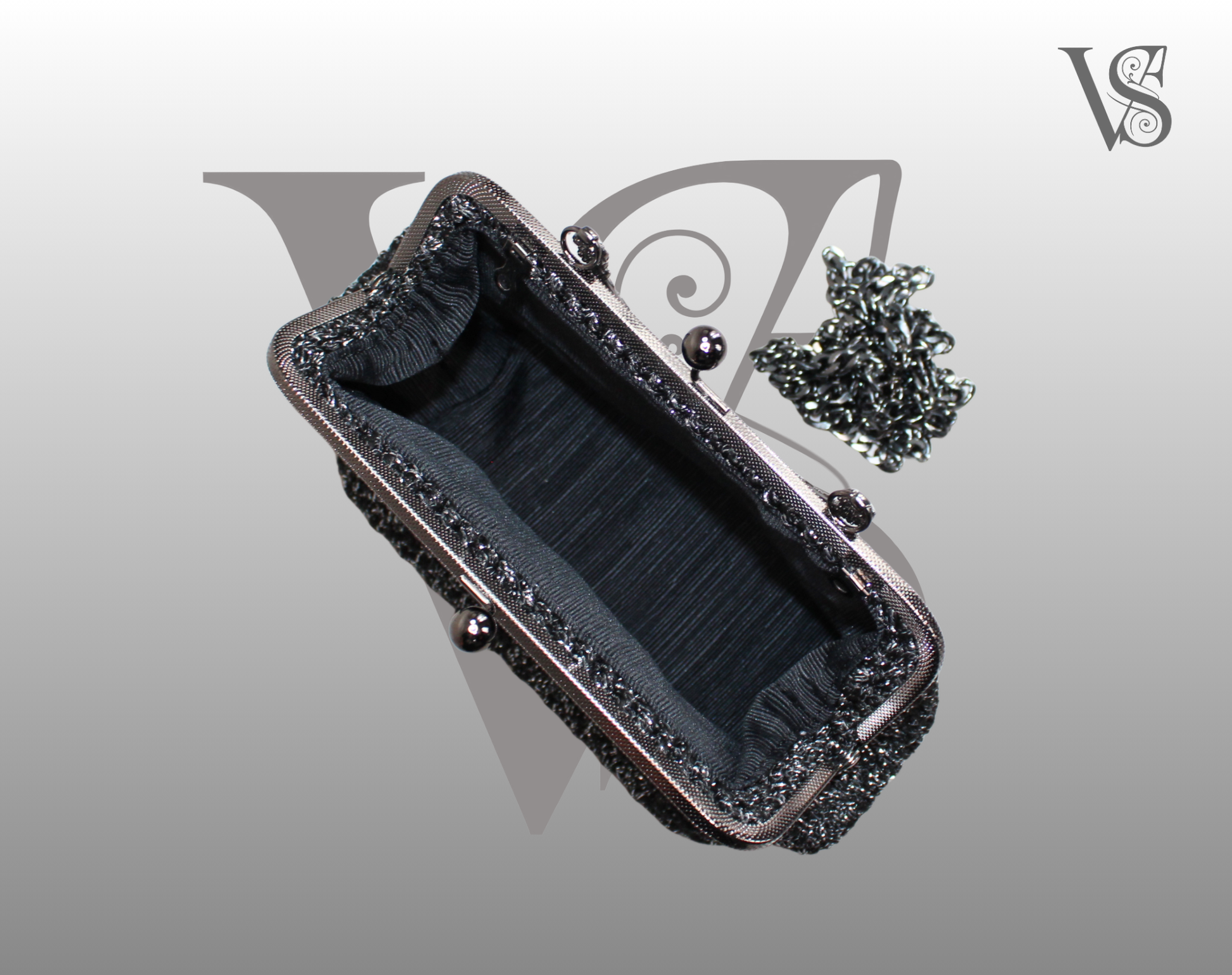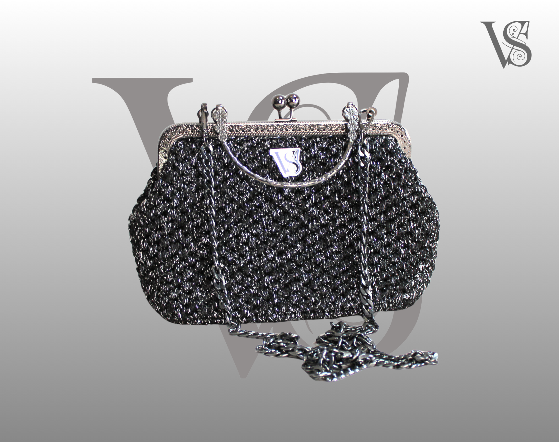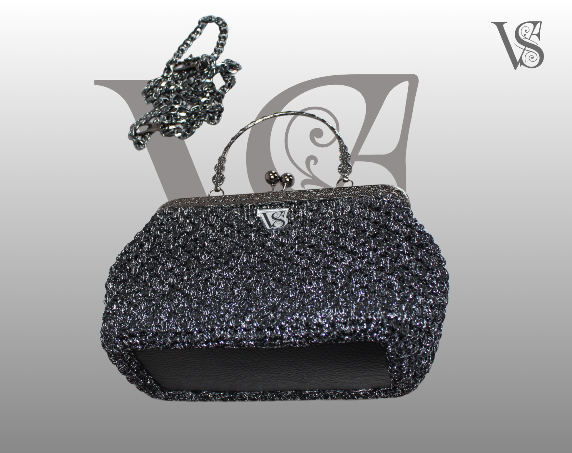 Il fondo in pelle conferisce struttura e resistenza, la chiusura clic clac con manico in metallo aggiunge un tocco rétro di classe, e la tracolla a catena color nickel completa l’insieme con discreta raffinatezza.