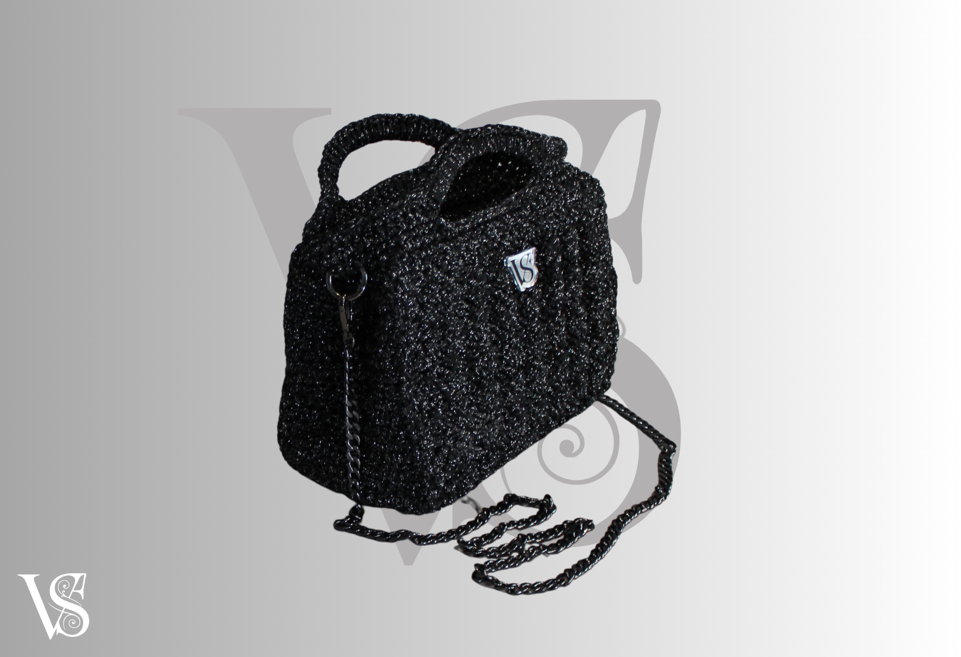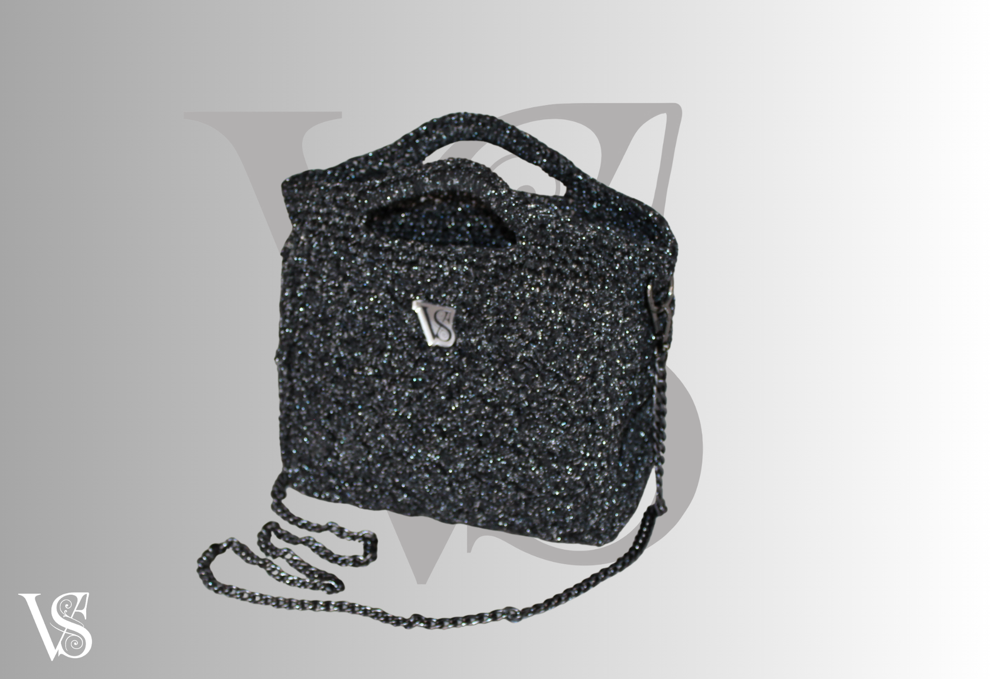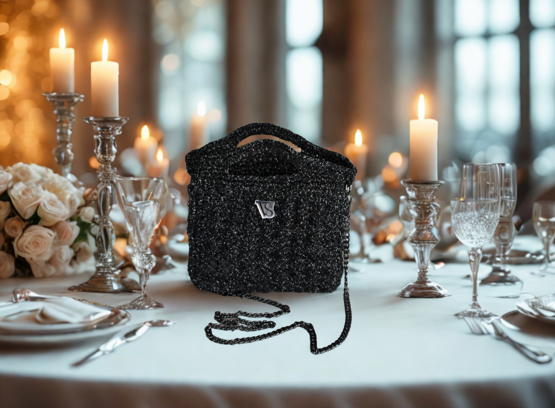 Borsa artigianale in cordino Swan Black Glitter – Eleganza luminosa lavorata a mano