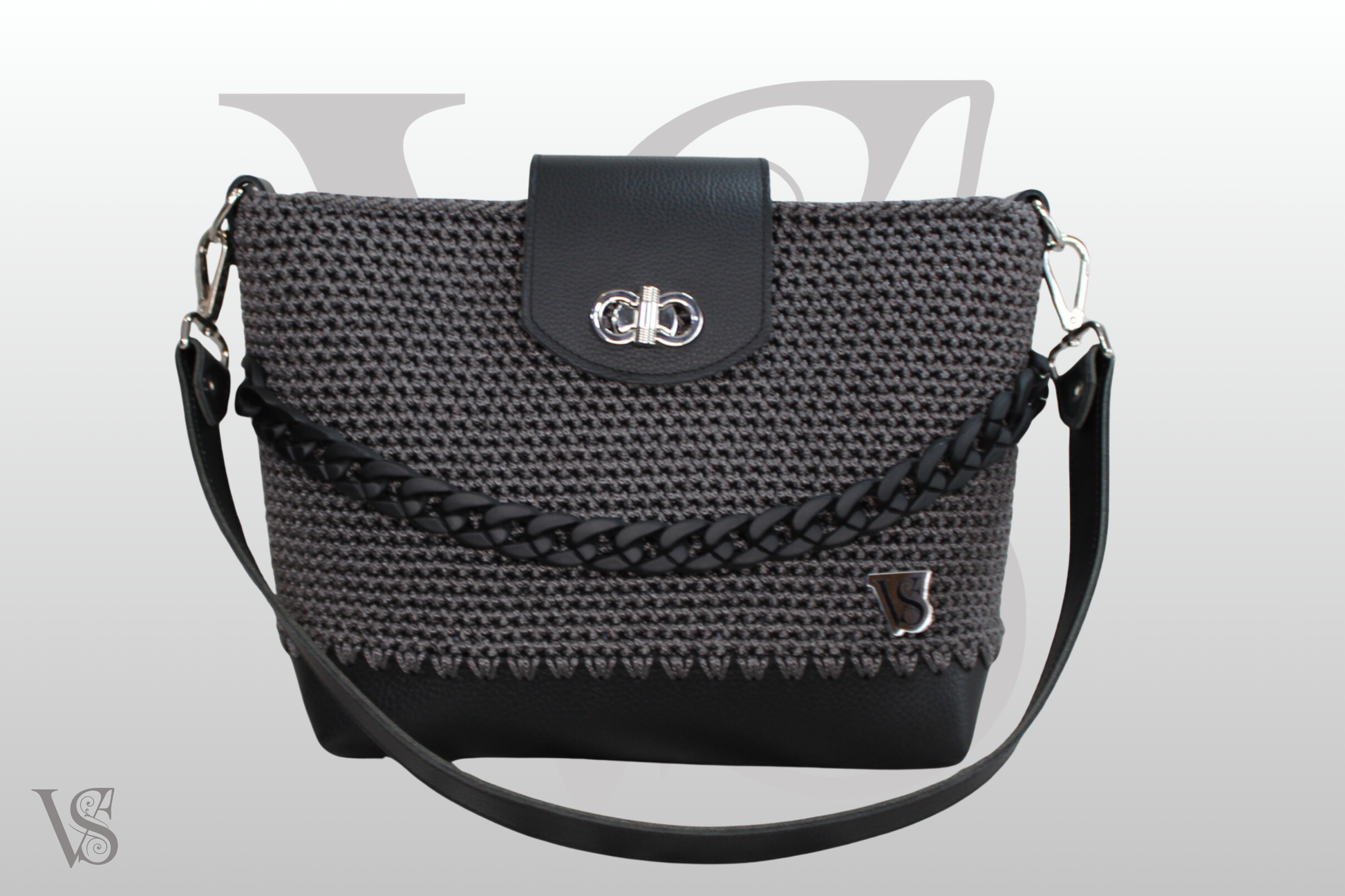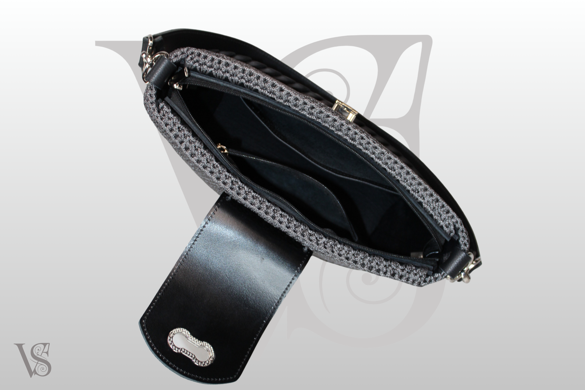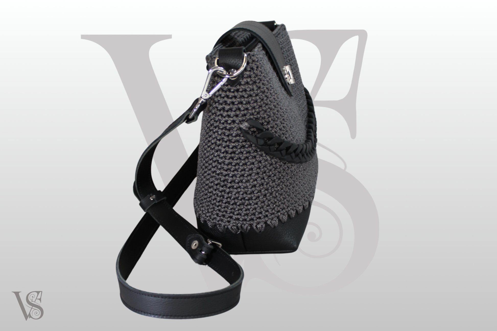 Il corpo della borsa è realizzato in cordino grigio scuro, lavorato a maglia bassa per conferire consistenza, definizione e un carattere tattile unico. La vera pelle nera, presente nei dettagli strutturali e nel fondo a vaschetta alto 5 cm, dona solidità, eleganza e una linea pulita che mantiene la sua forma nel tempo.