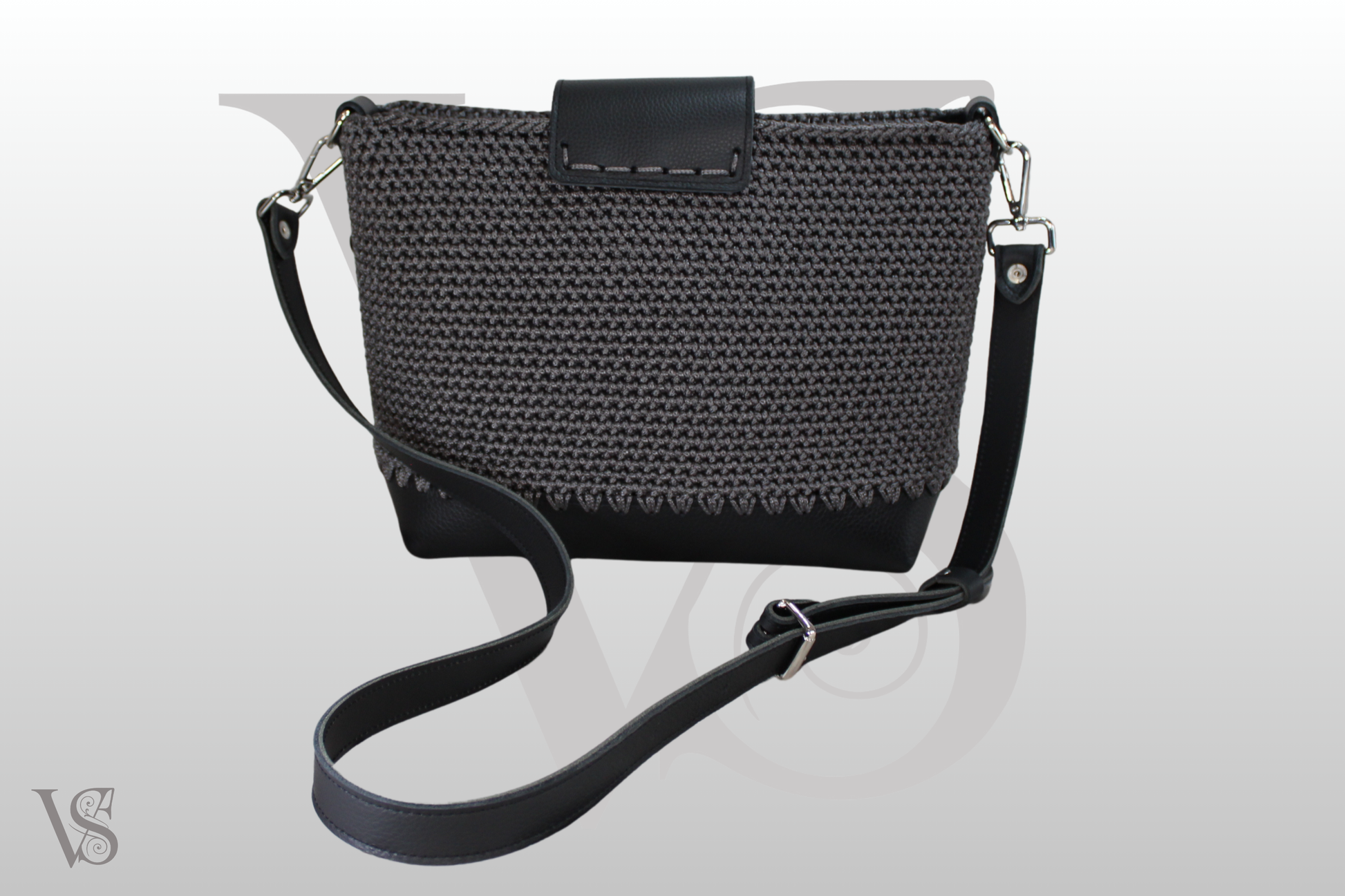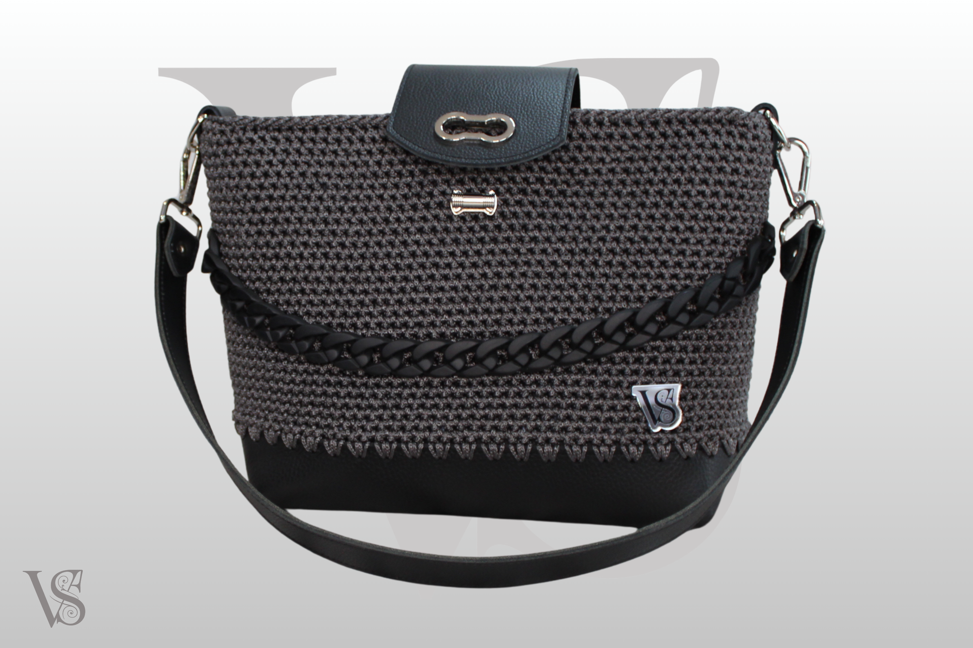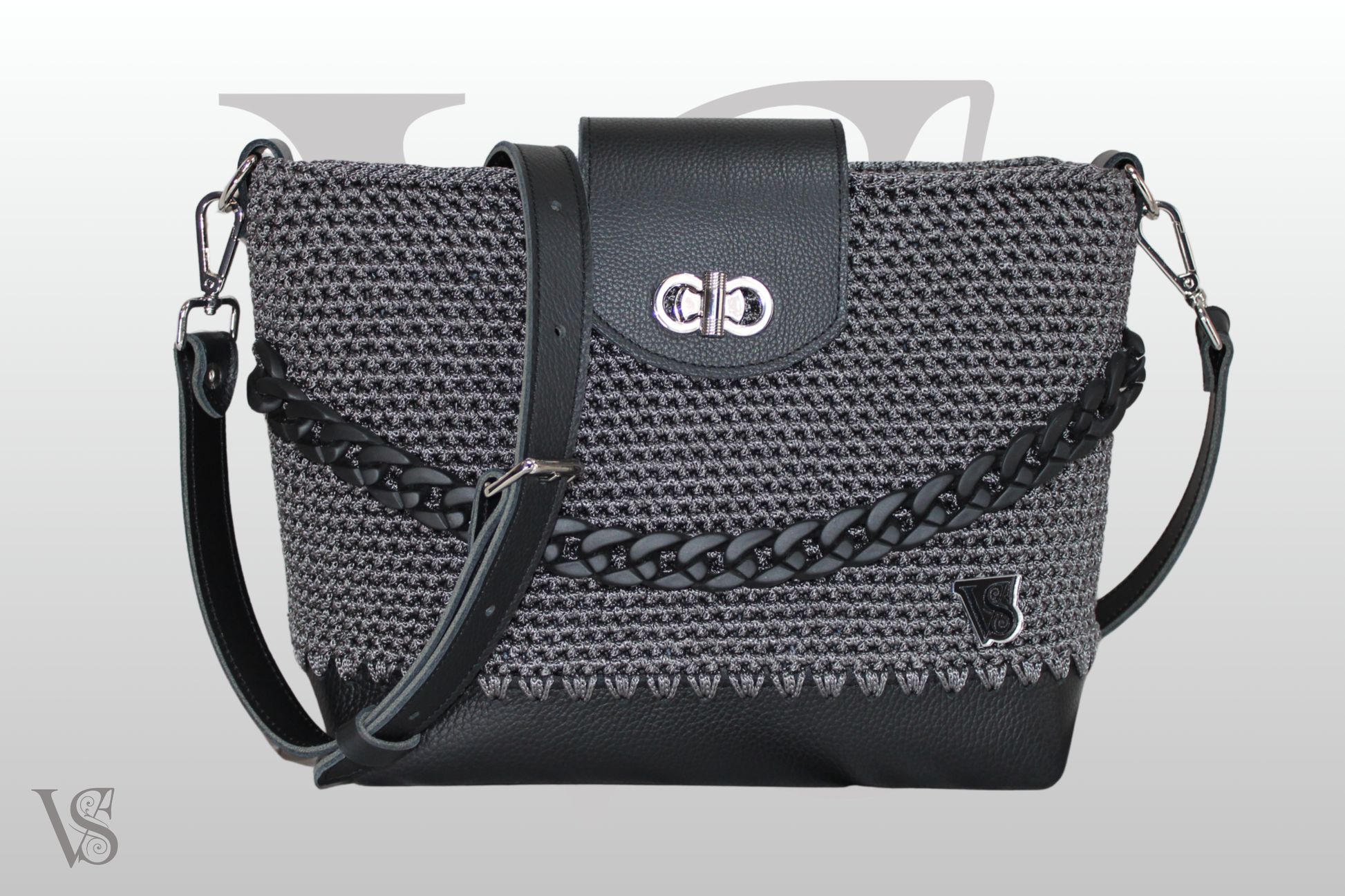 Il corpo della borsa è realizzato in cordino grigio scuro, lavorato a maglia bassa per conferire consistenza, definizione e un carattere tattile unico. La vera pelle nera, presente nei dettagli strutturali e nel fondo a vaschetta alto 5 cm, dona solidità, eleganza e una linea pulita che mantiene la sua forma nel tempo.